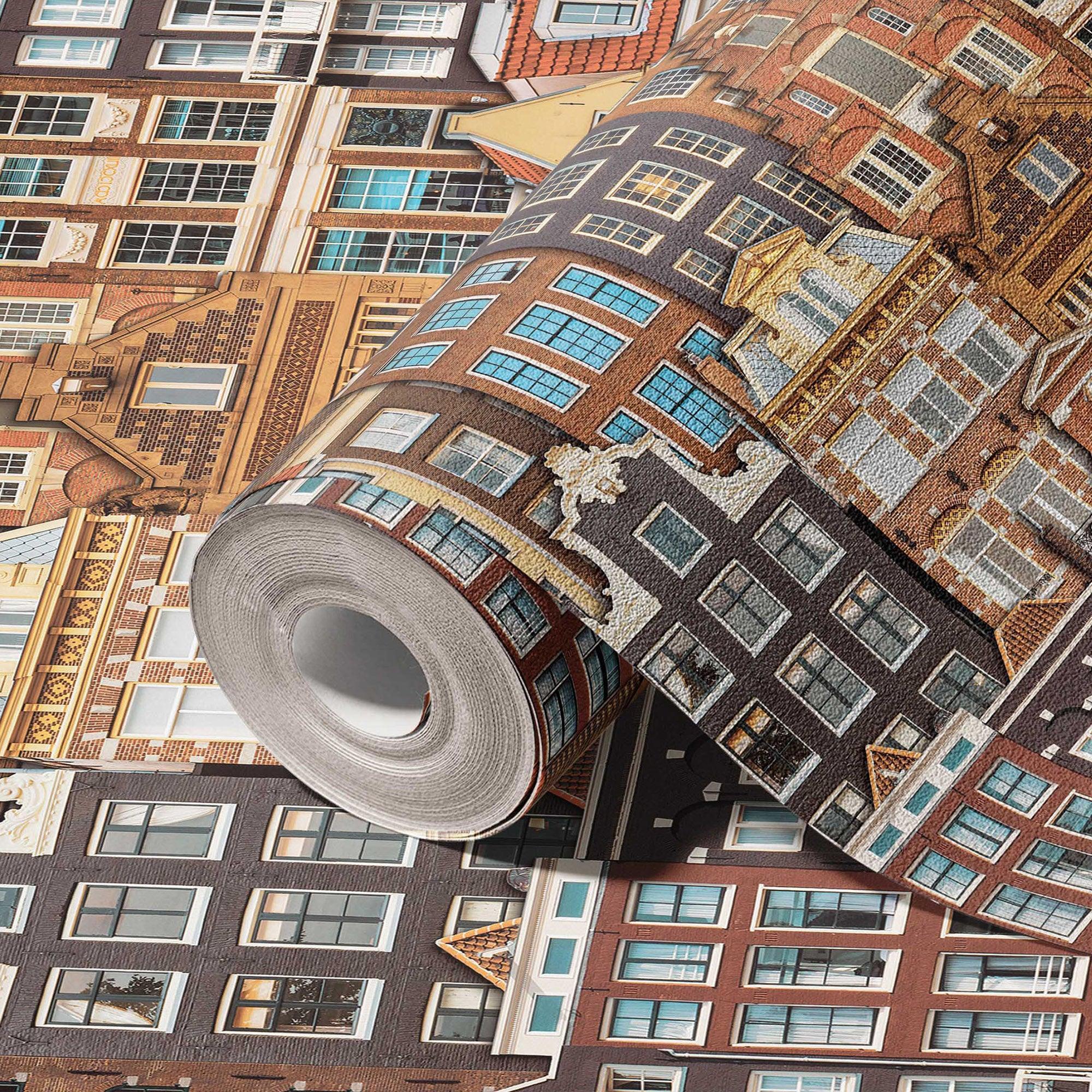 Cityscape 3D Embossed Wallpaper, Red, Orange Realistic Houses Apartments Design, Home Wall Decor, Modern Wallcovering