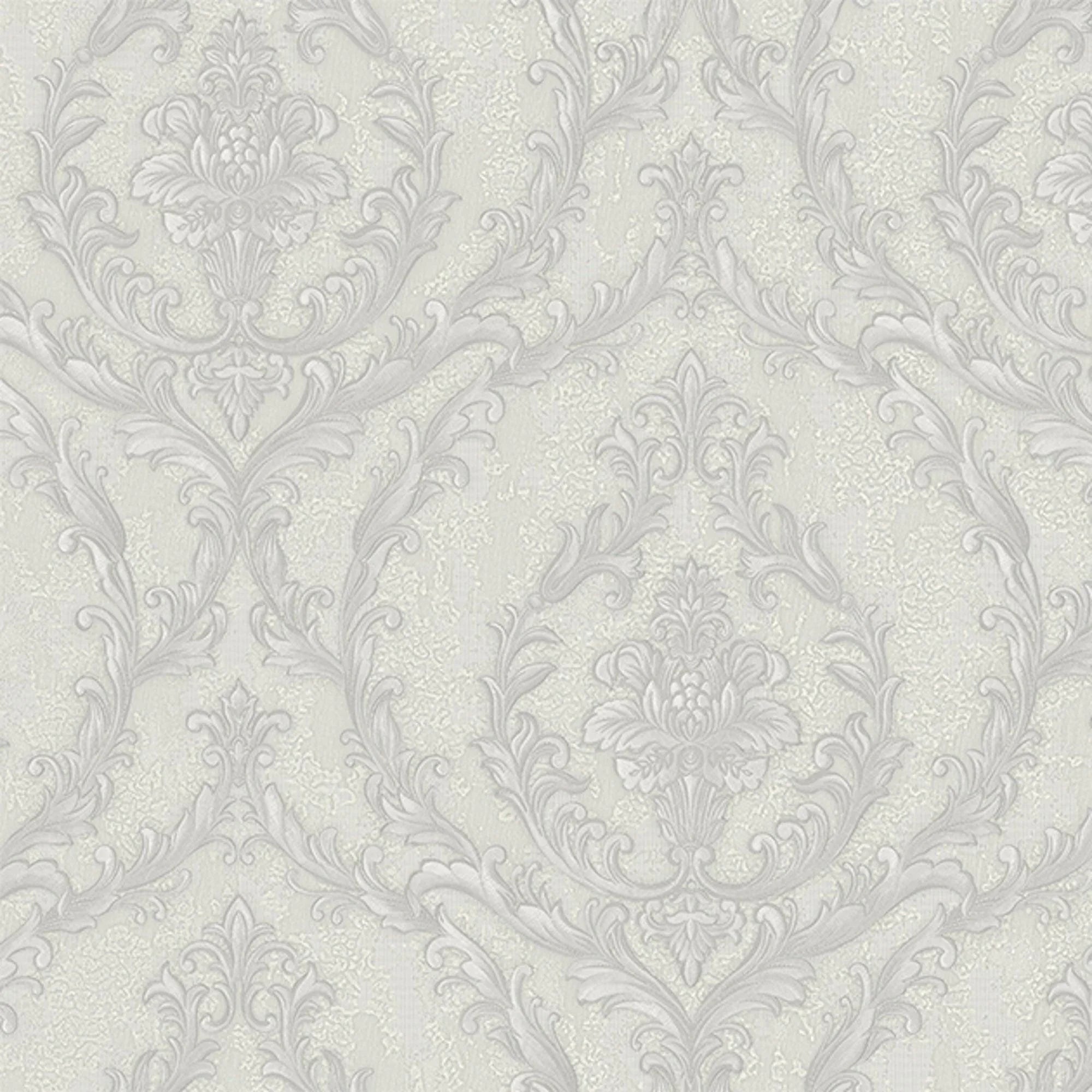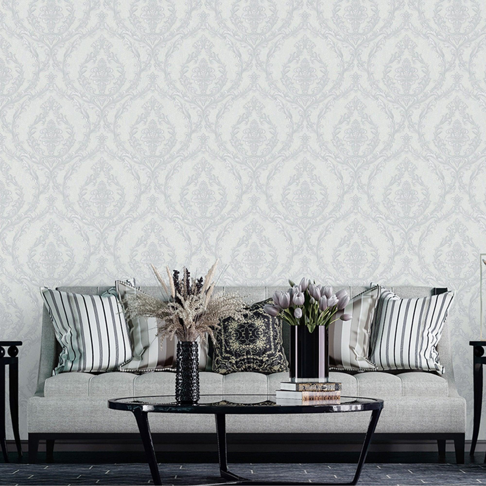 Damask Deep Embossed Wallpaper, Light Gray, White Luxury 3D Non-Pasted Wallcovering, Shimmering, Traditional Non-Woven Wall Decor