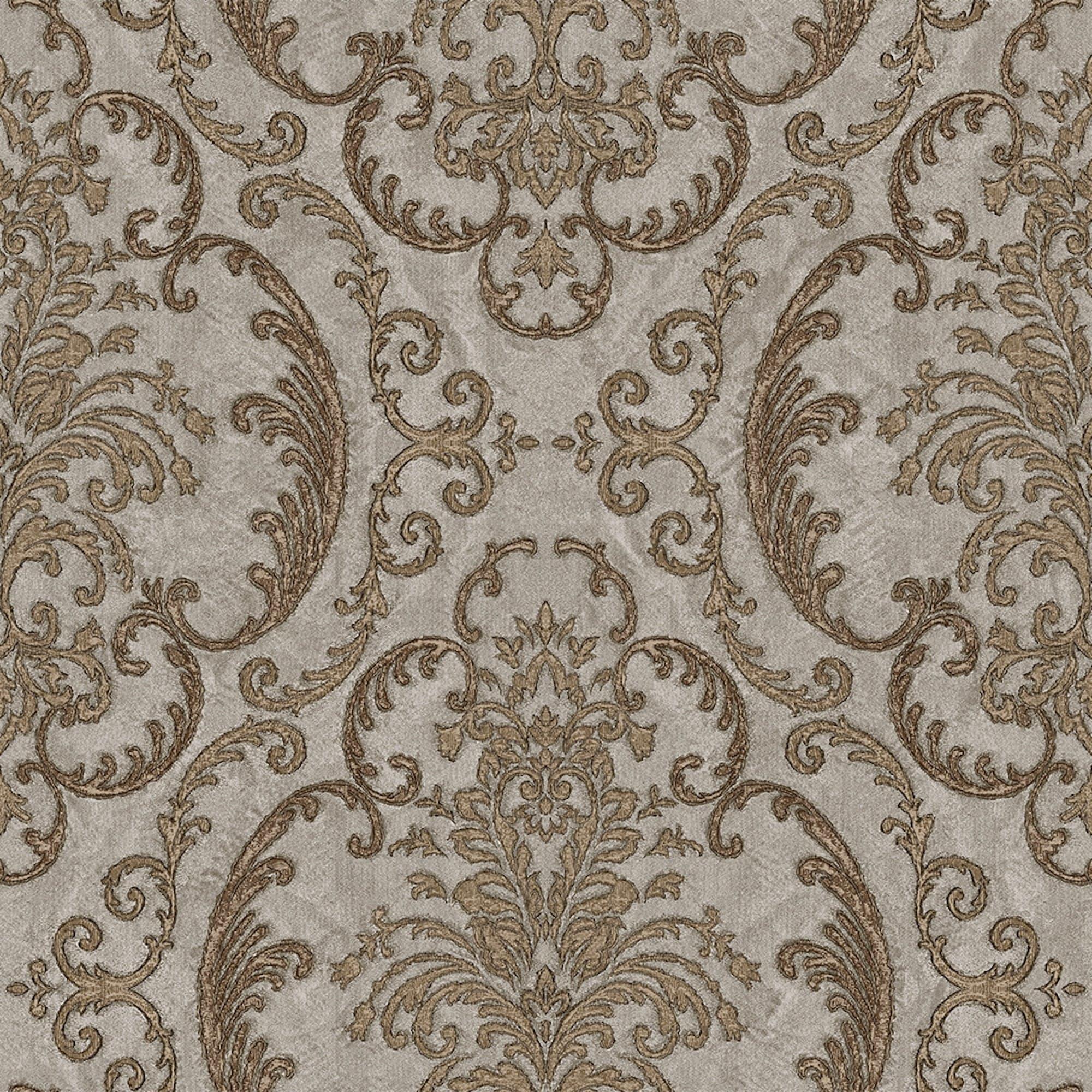 Deep Embossed Sparkling Damask Wallpaper, Stylish Brown Gray Glittering Luxury Fabric Feel Vivid Colors, Home Commercial Use, Easy Clean, Water Resistant