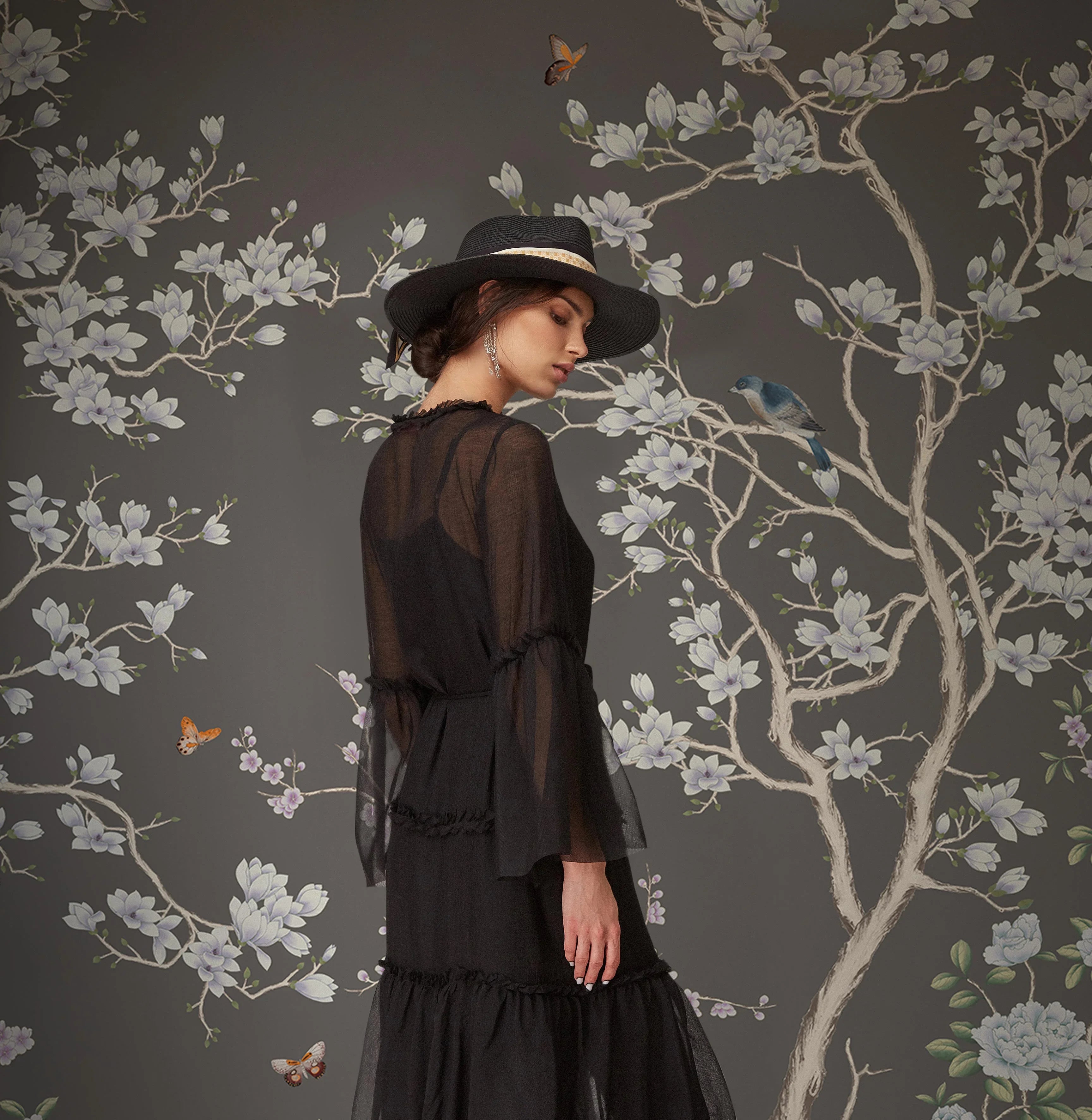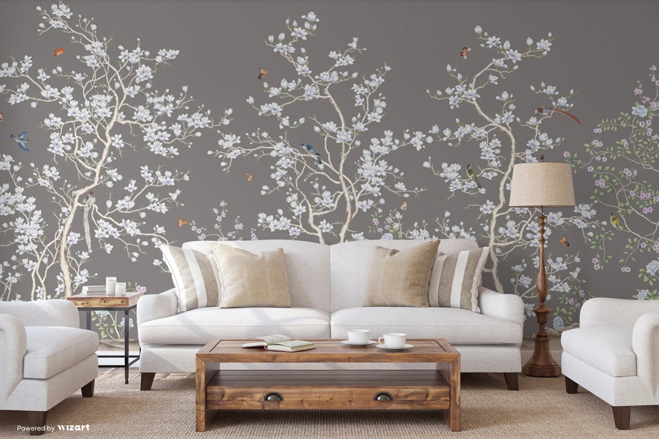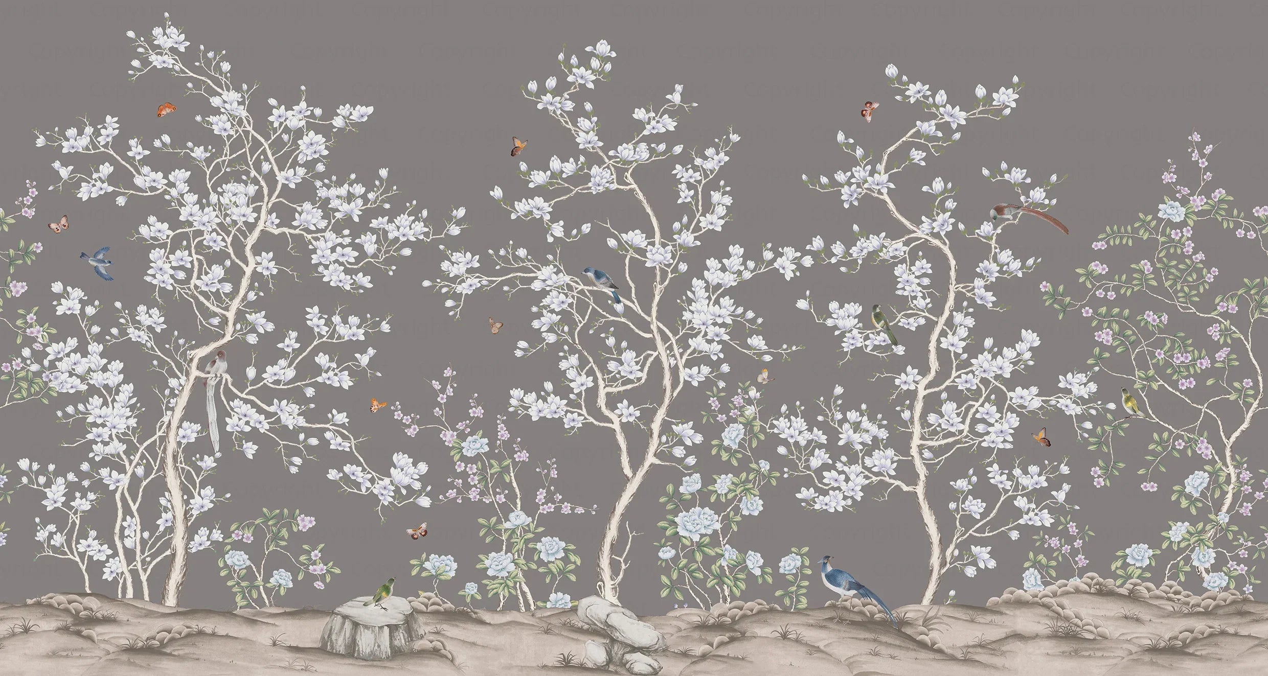 Gray Chinoiserie Floral Wall Mural, Birds Tree Flowers Wallpaper, Custom Size Wall Covering, Non-Woven, Non-Adhesive, Removable, Washable