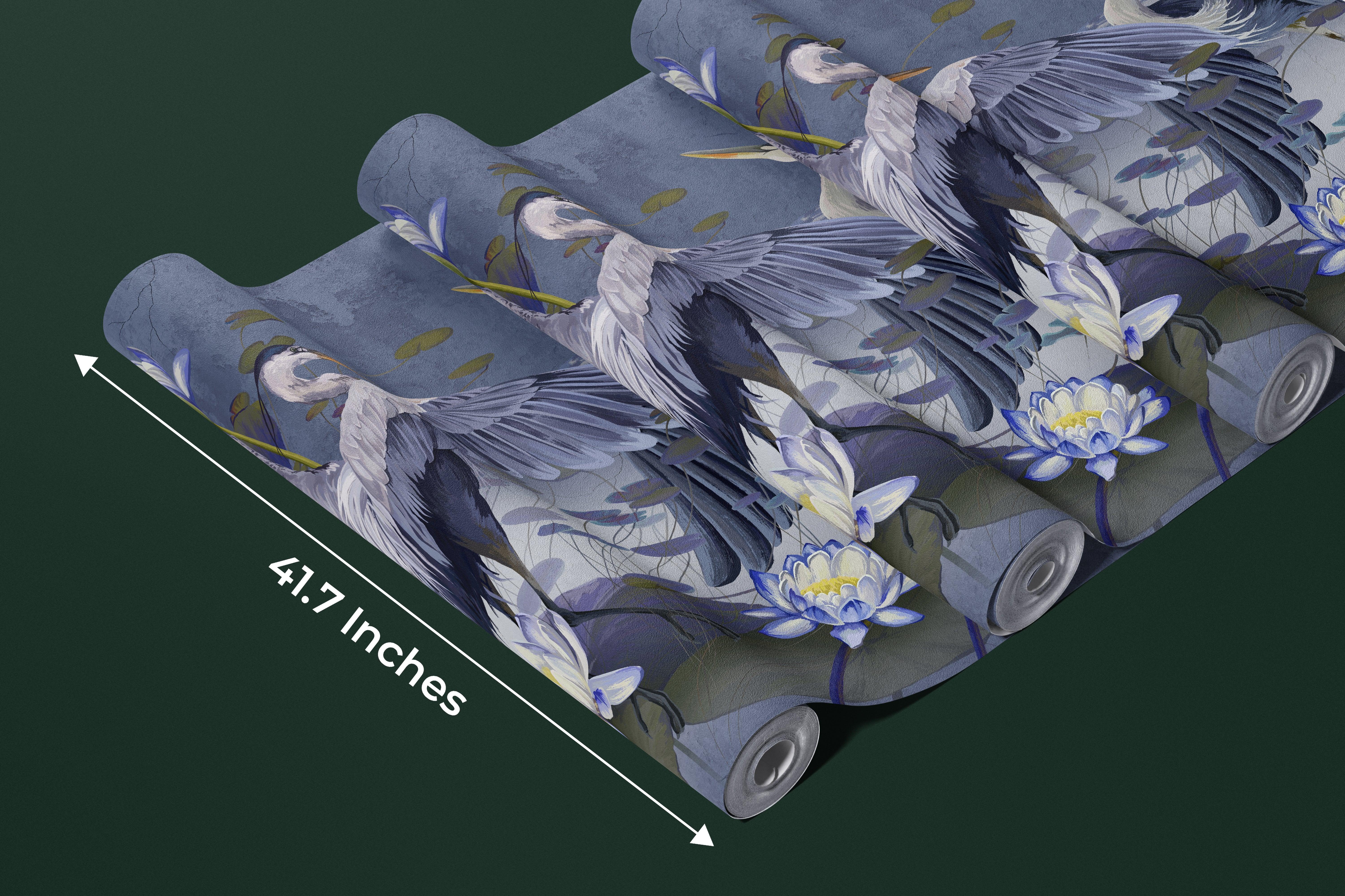 Birds Wallpaper, Lotus and Blue Background Mural, Oversized Custom Size Wall Art, Non-Woven, Non-Adhesive, Modern Wall Paper, Removable