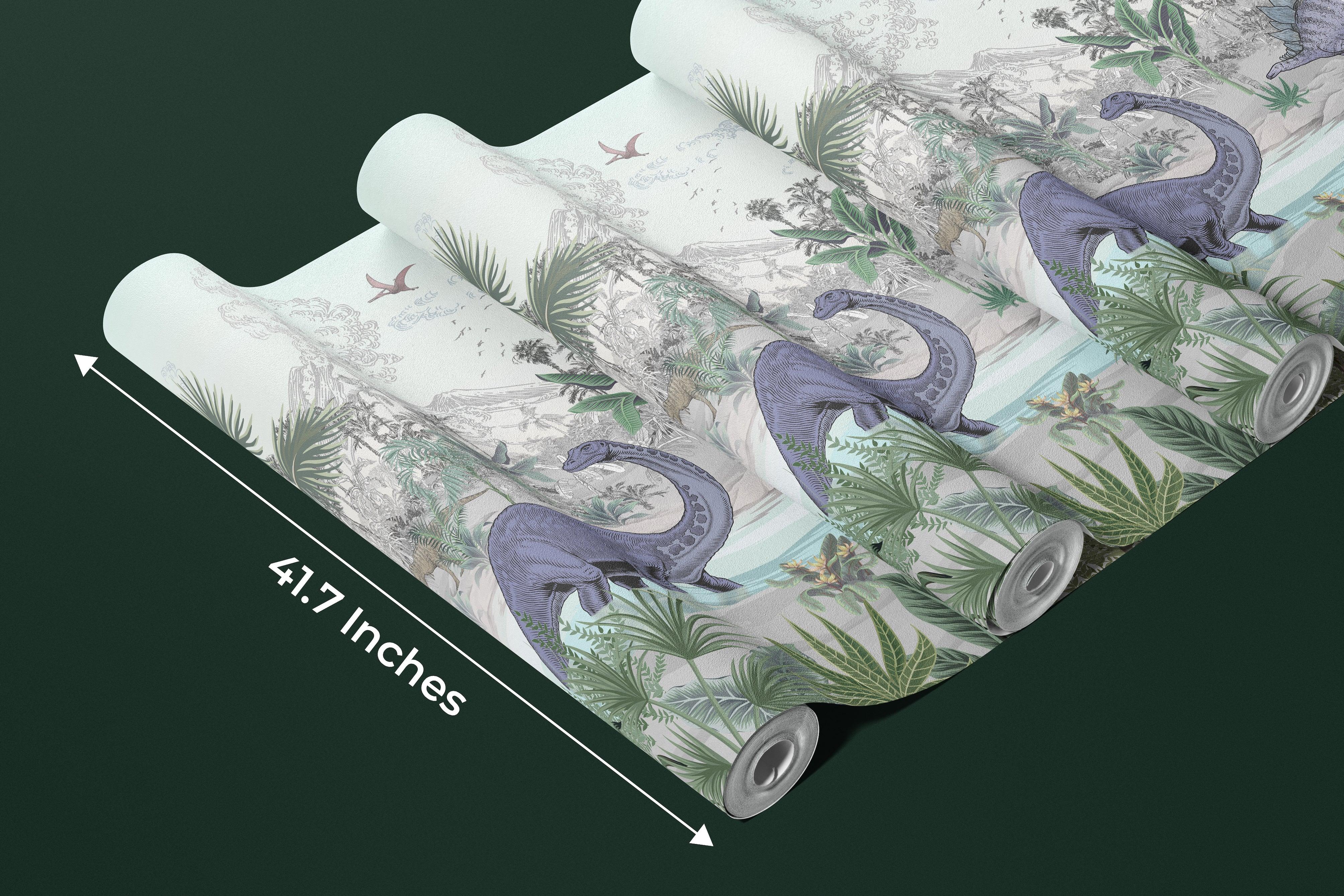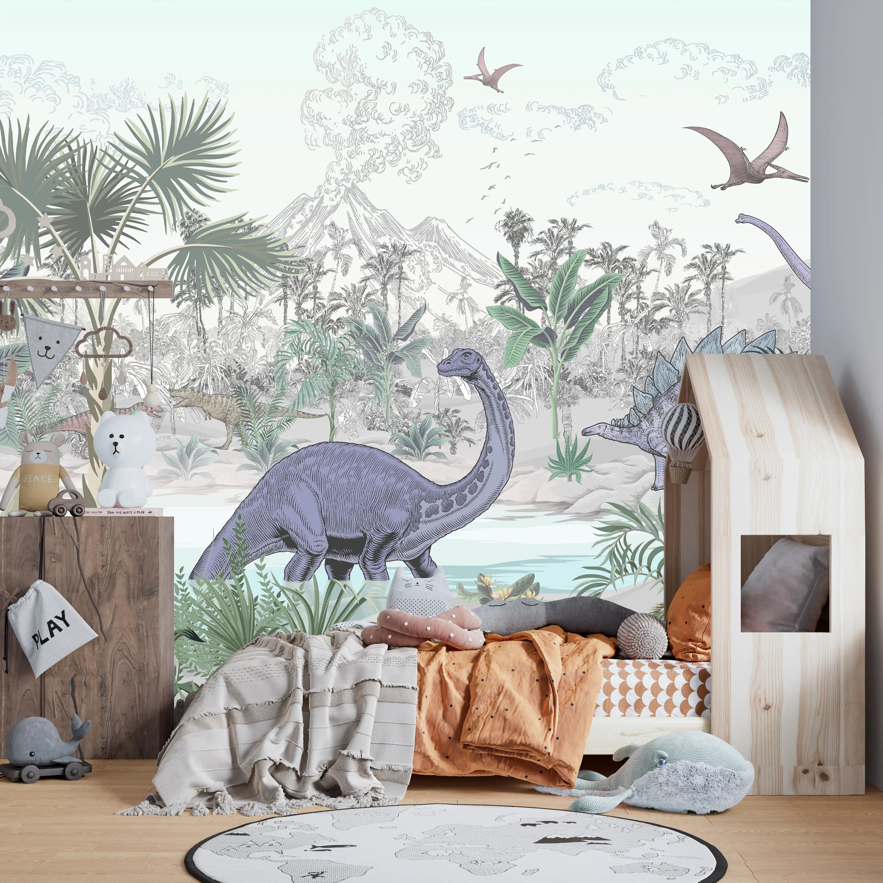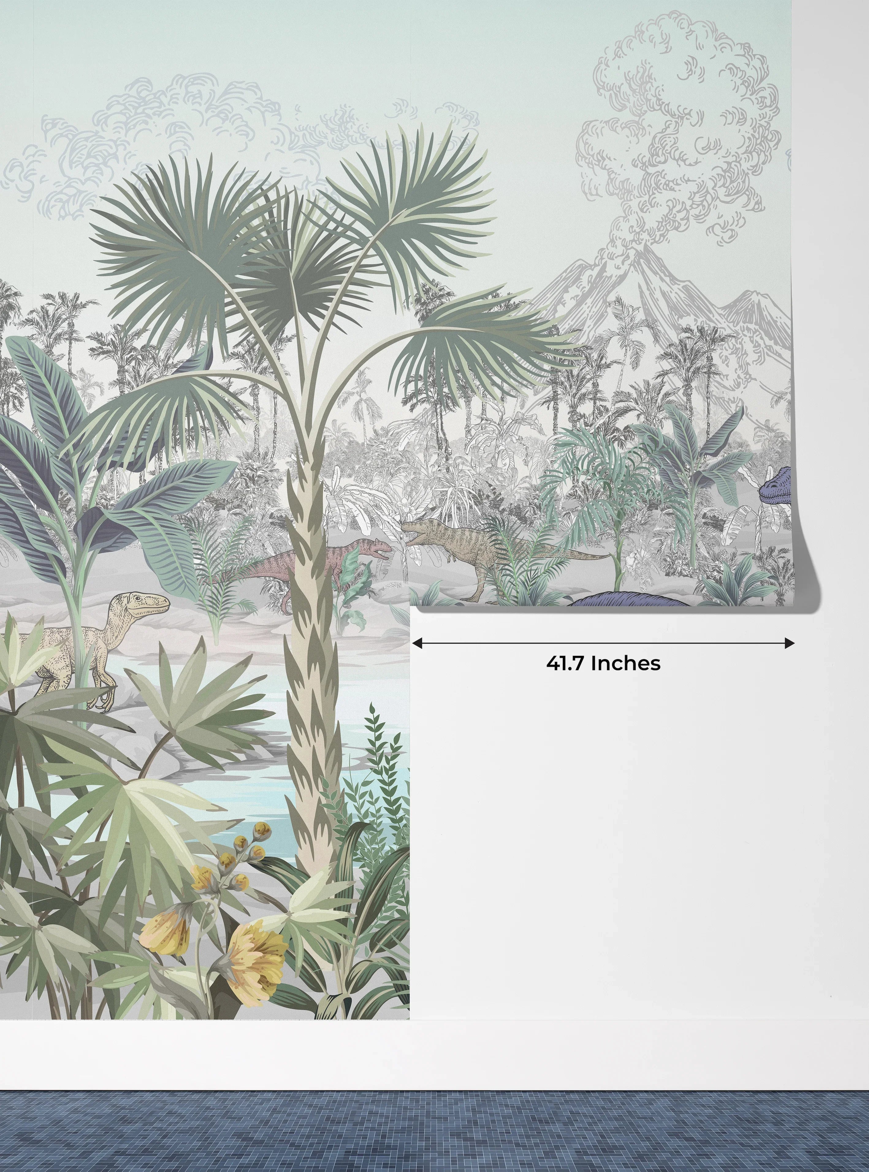Blue Dino World Wallpaper, Jungle Mural, Oversized Custom Size Wall Art, Non-Woven, Non-Adhesive, Modern Wall Paper, Removable