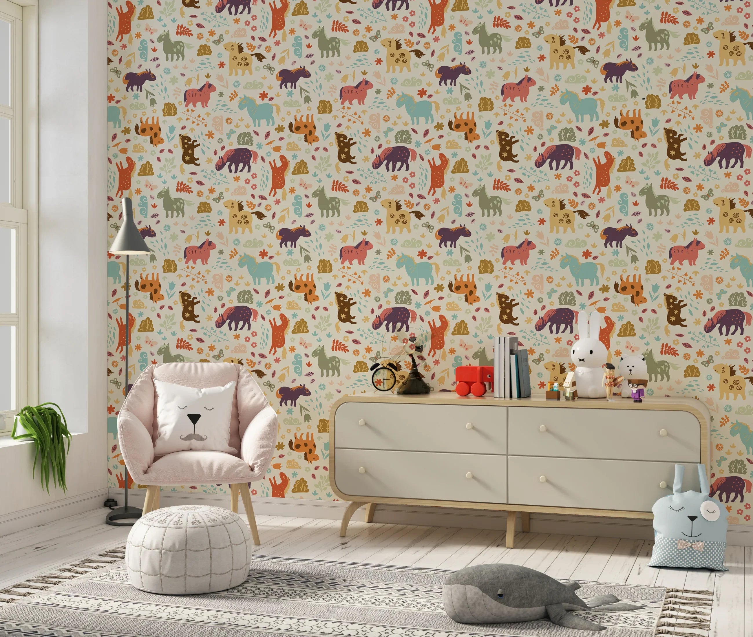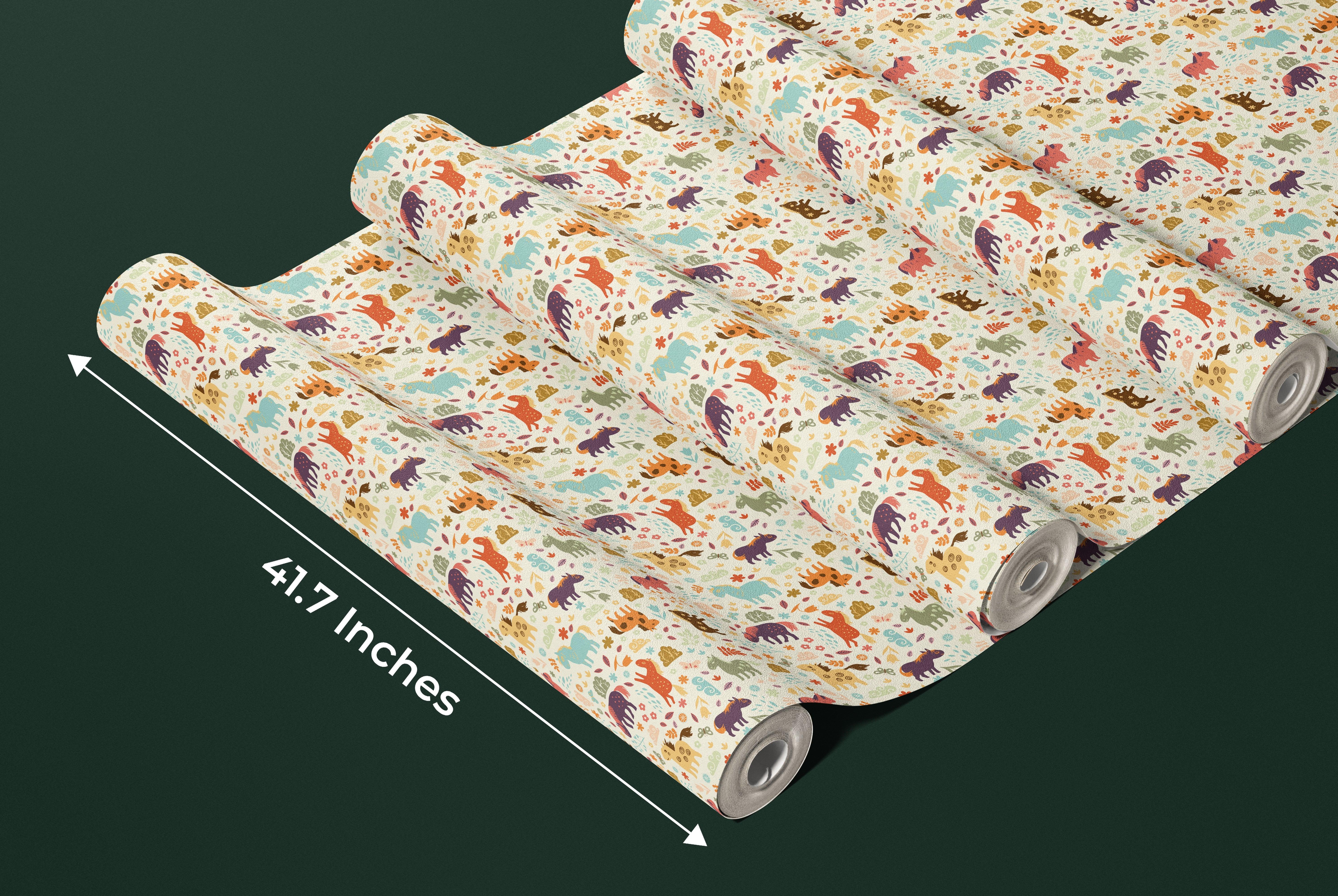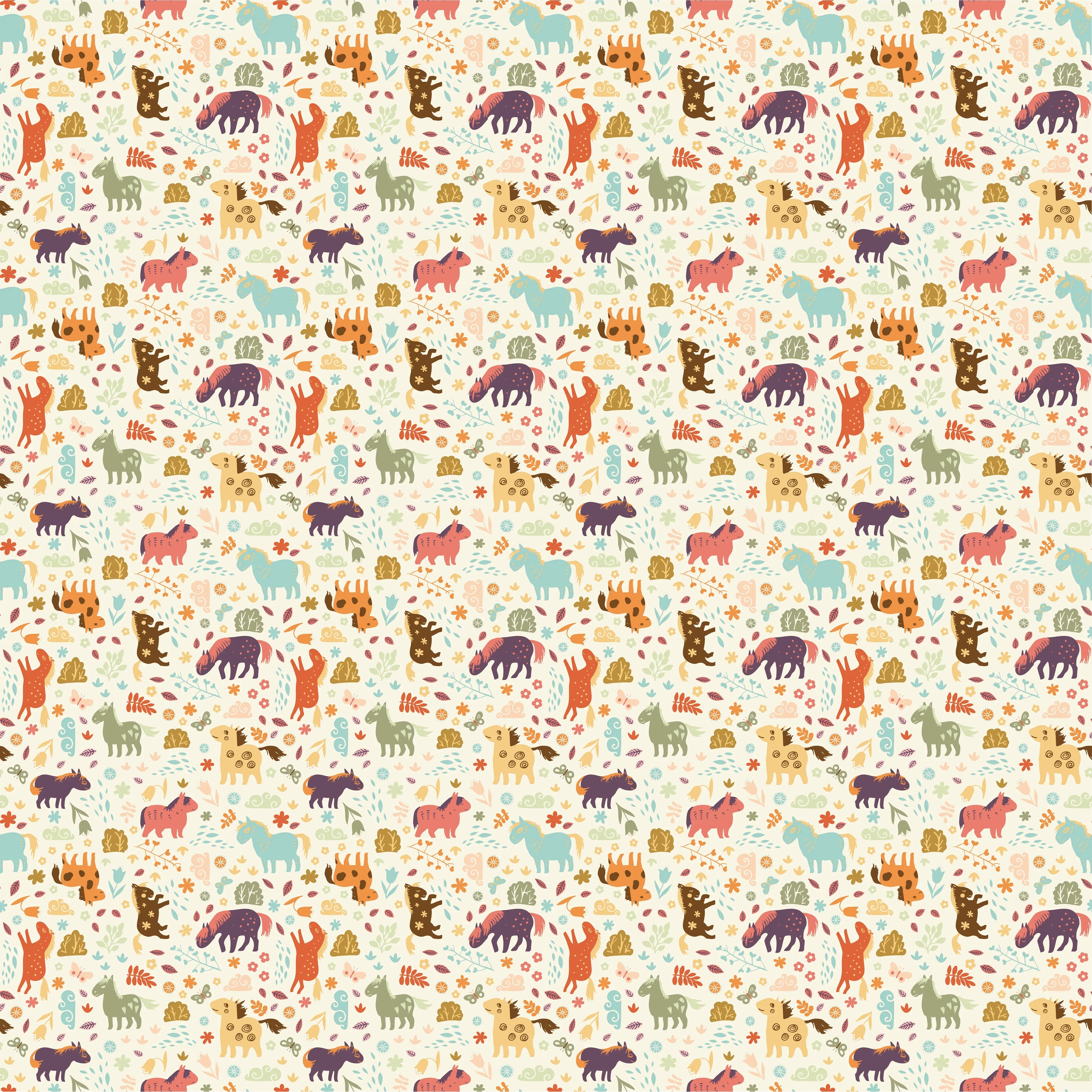 Horses, Clouds, Flowers Wallpaper, Sweet Seamless Pattern Mural, Oversized Custom Size Wall Art, Non-Woven, Non-Adhesive, Modern Wall Paper, Removable