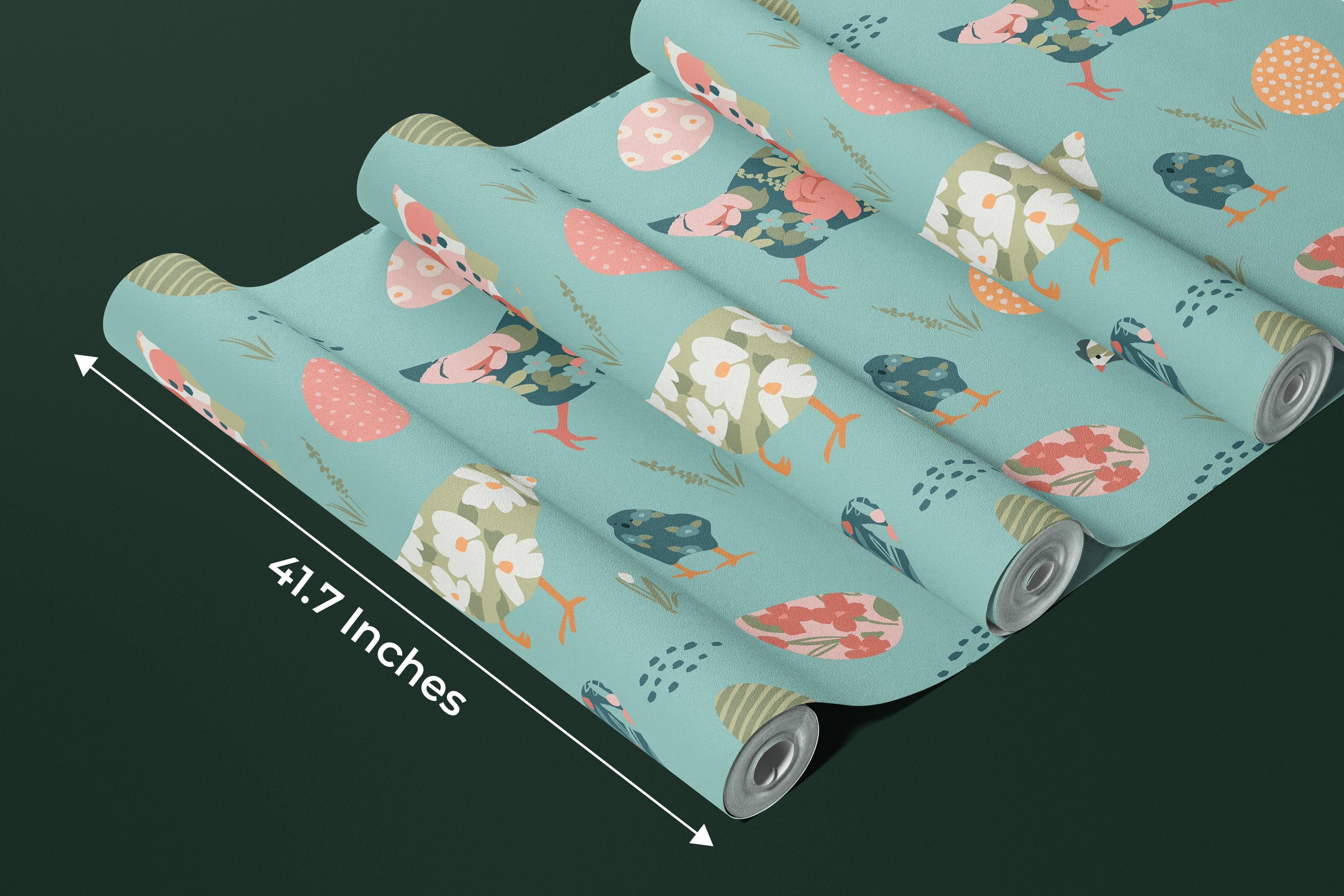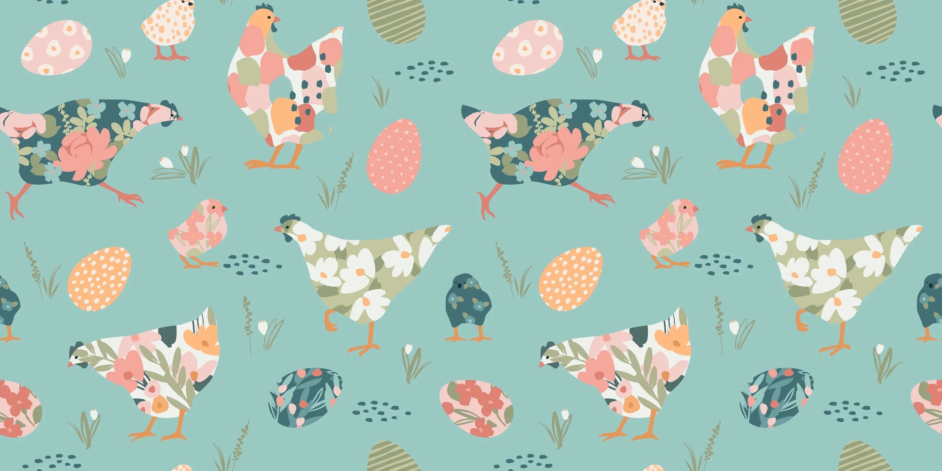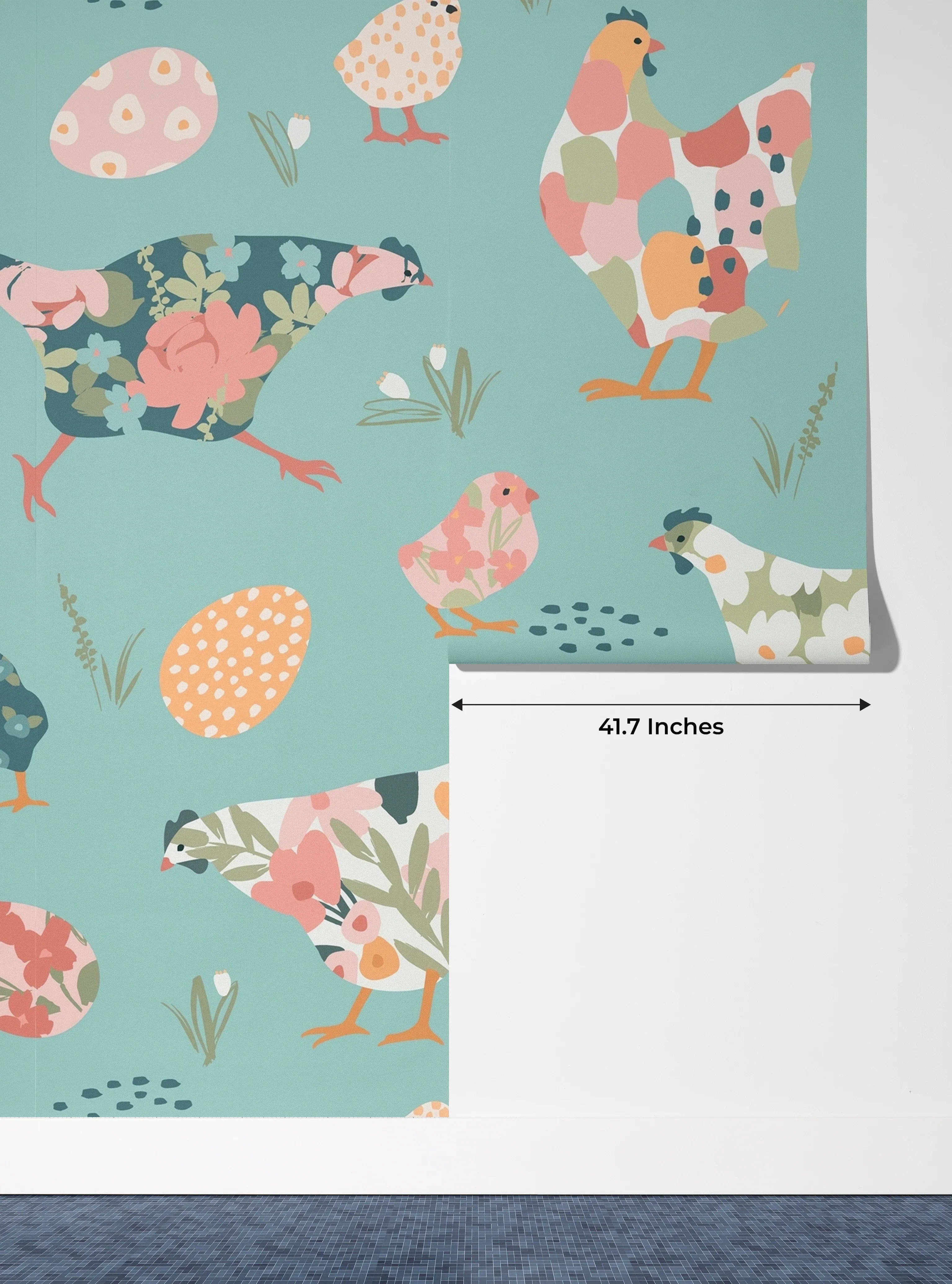 Chickens with Abstract Flowers Wallpaper, Seamless Pattern Mural, Oversized Custom Size Wall Art, Non-Woven, Non-Adhesive, Modern Wall Paper, Removable
