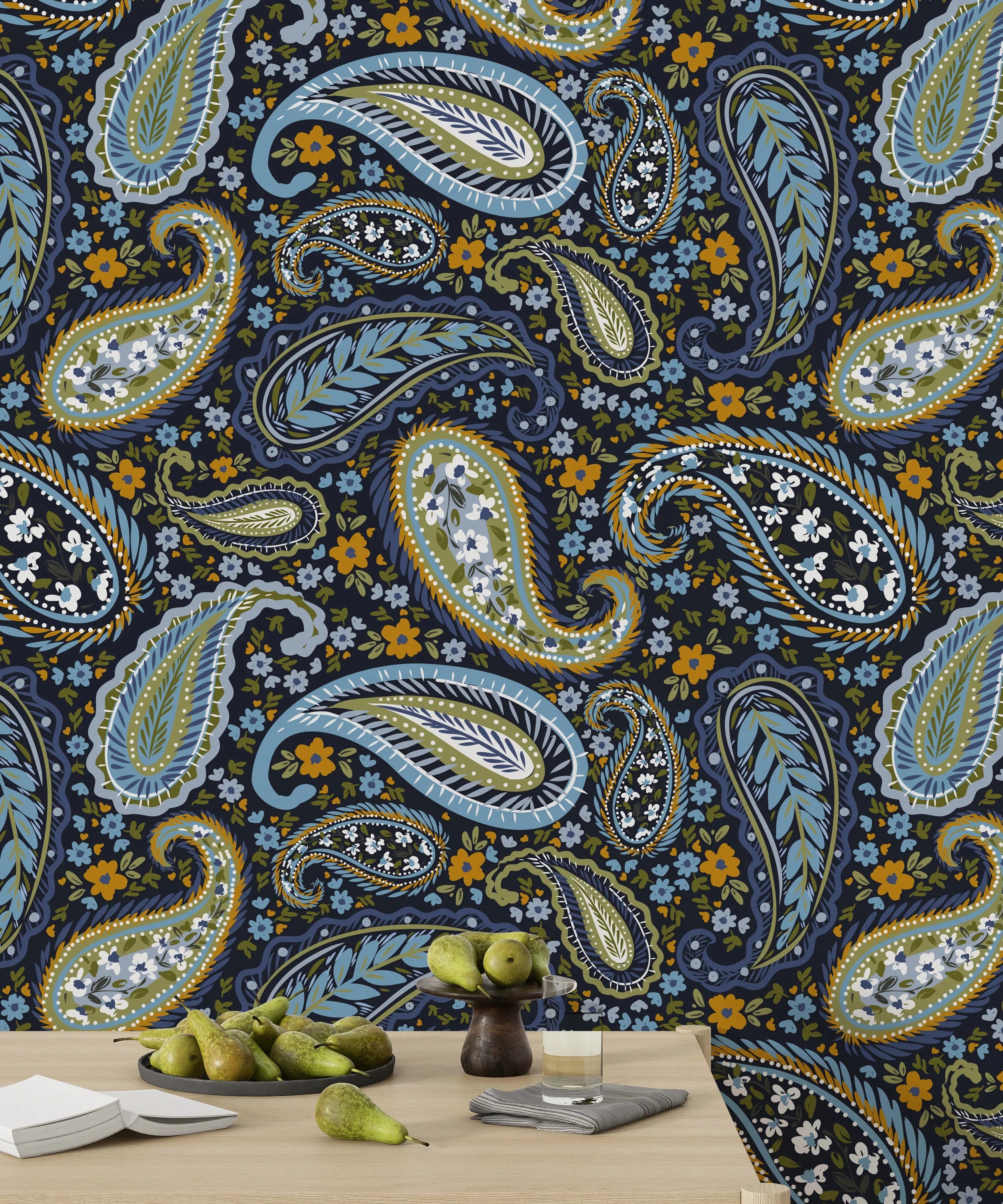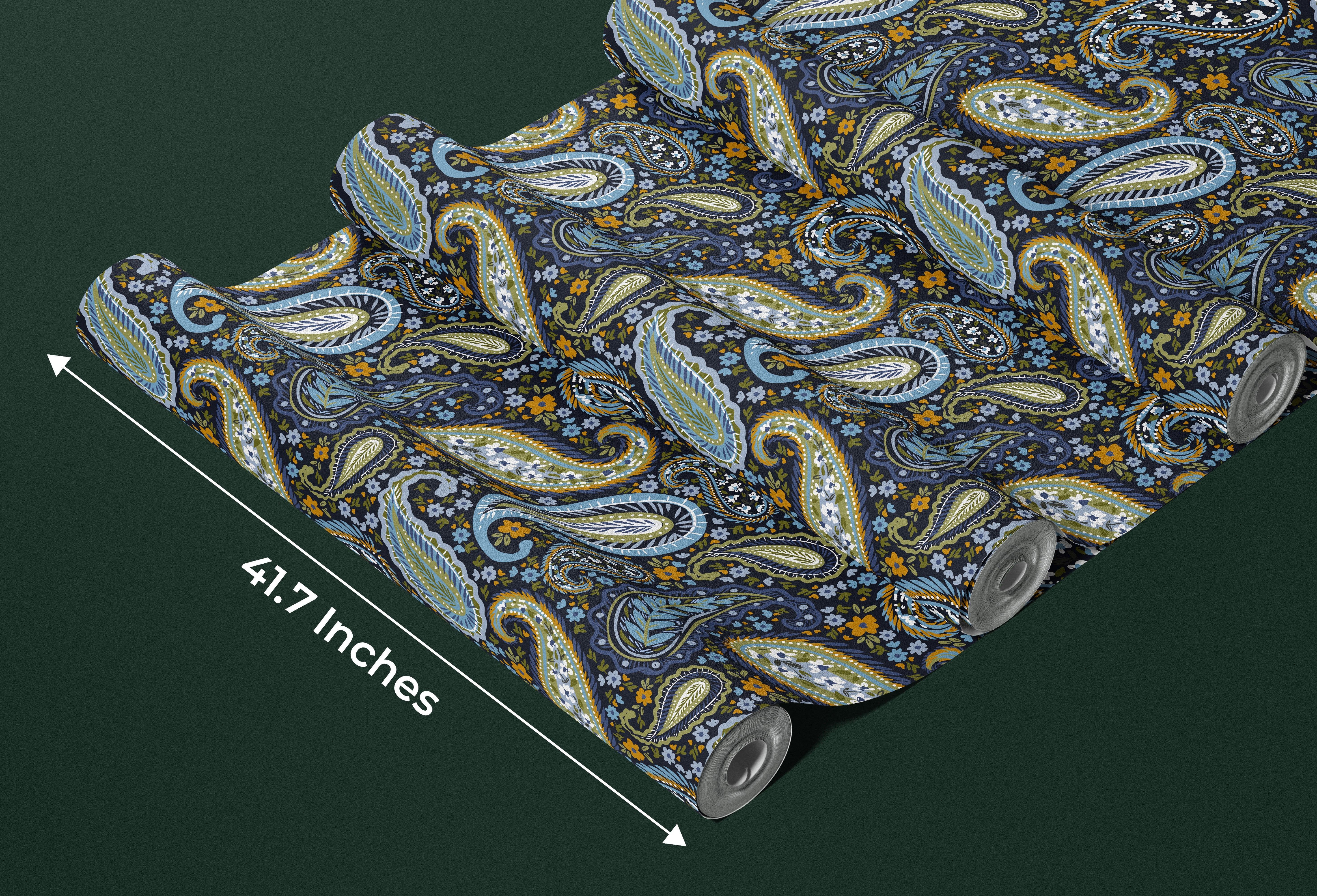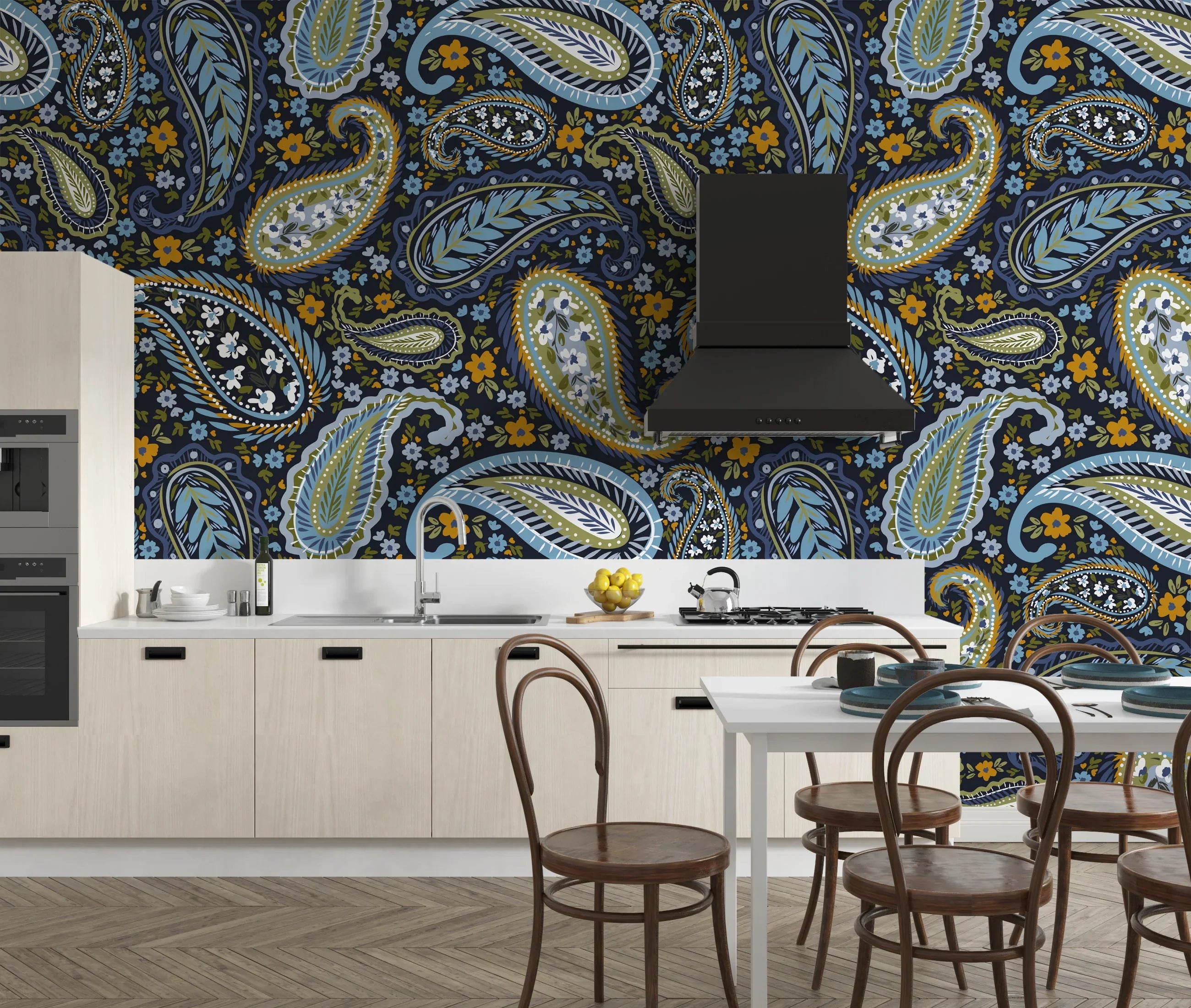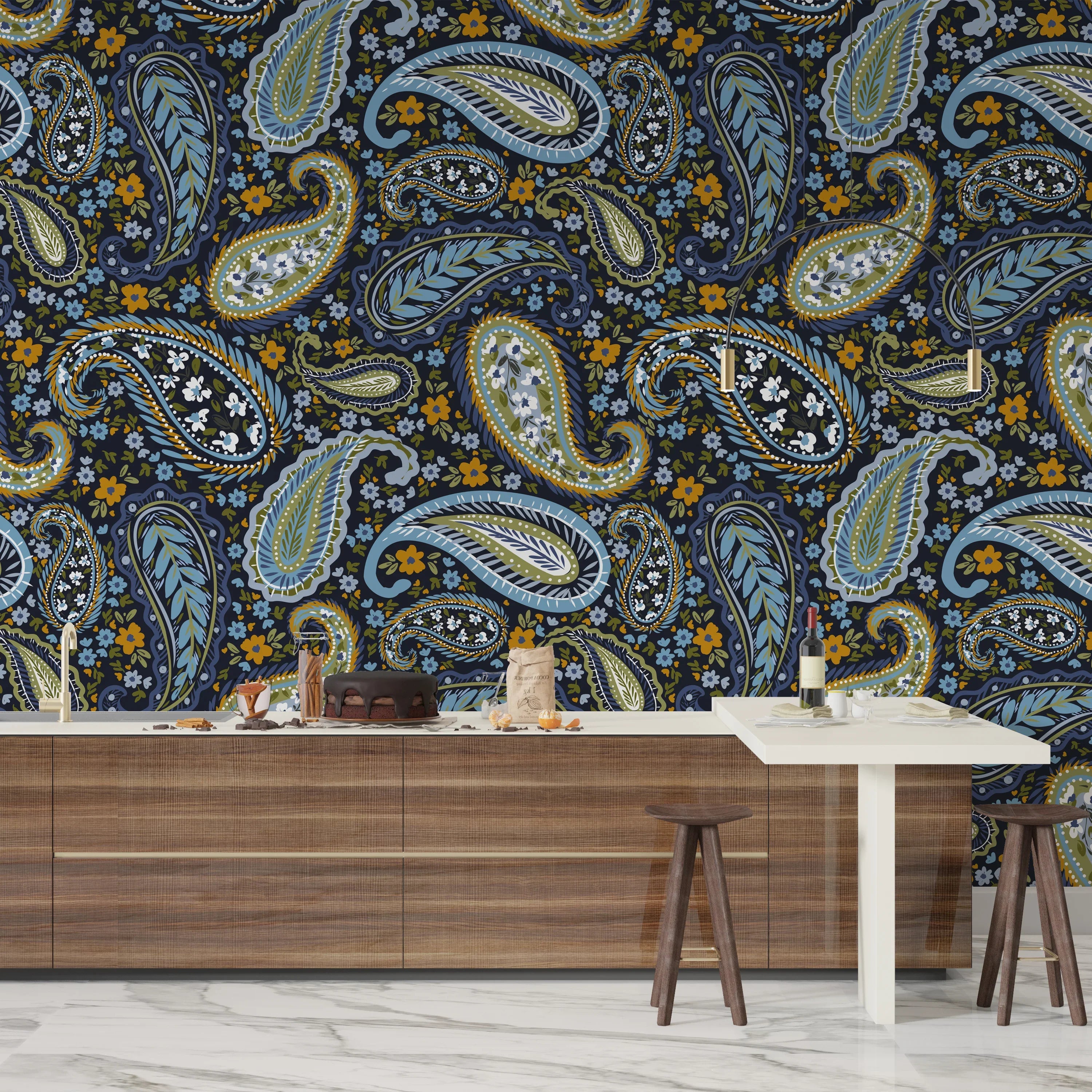 Indian Floral Pattern Wallpaper, Dark Background Mural, Oversized Custom Size Wall Art, Non-Woven, Non-Adhesive, Modern Wall Paper, Removable