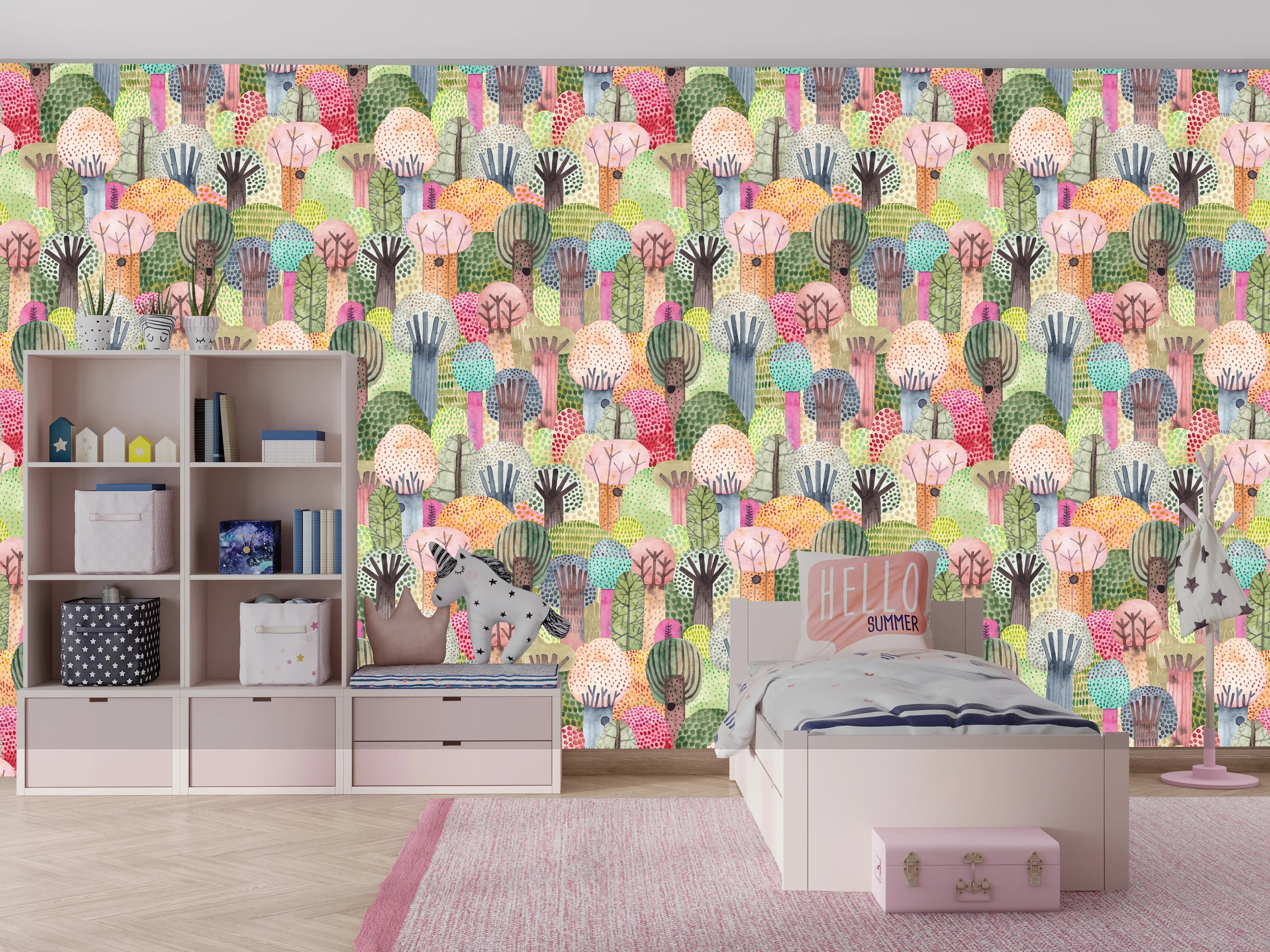 Childish Forest Wallpaper, Seamless Pattern Mural, Oversized Custom Size Wall Art, Non-Woven, Non-Adhesive, Modern Wall Paper, Removable
