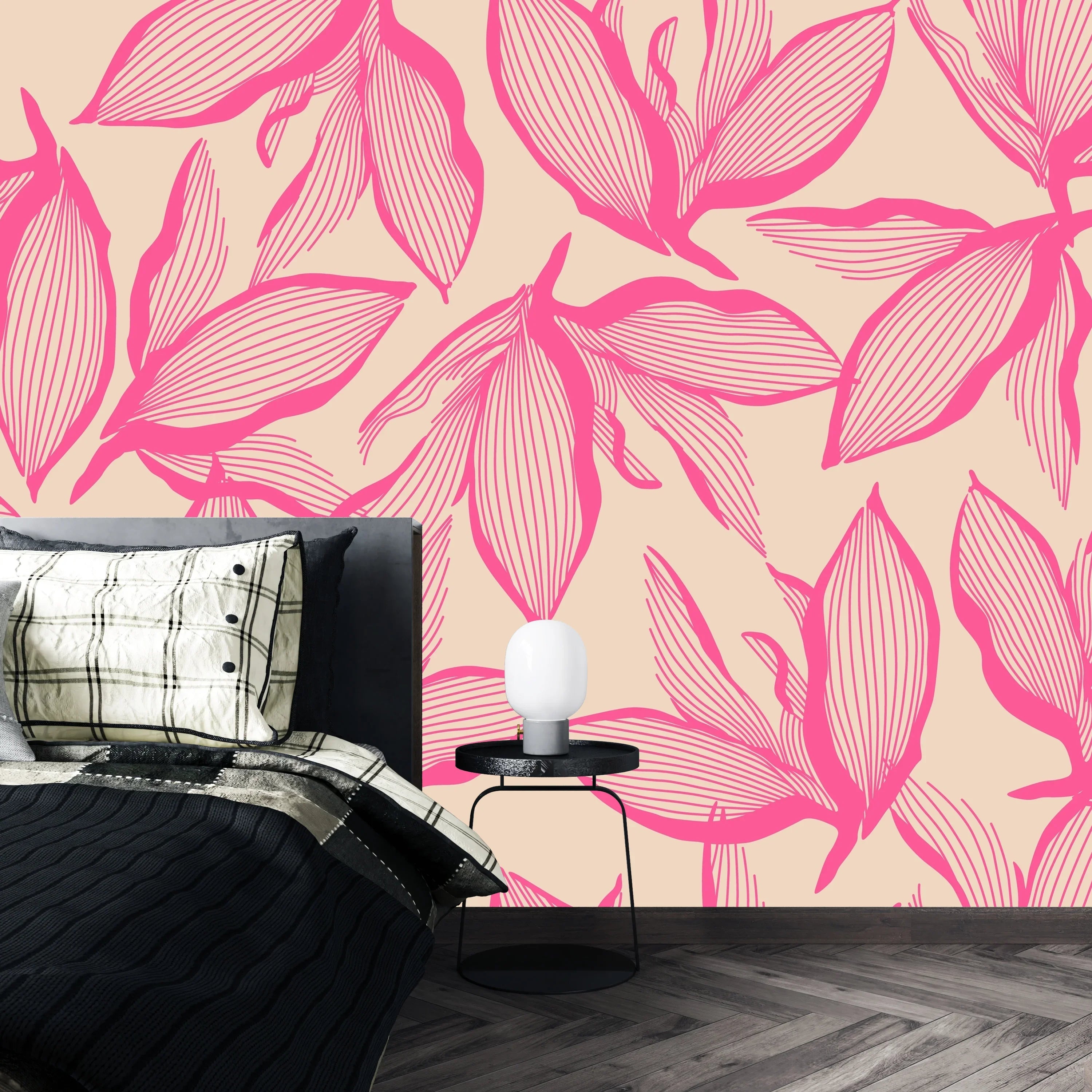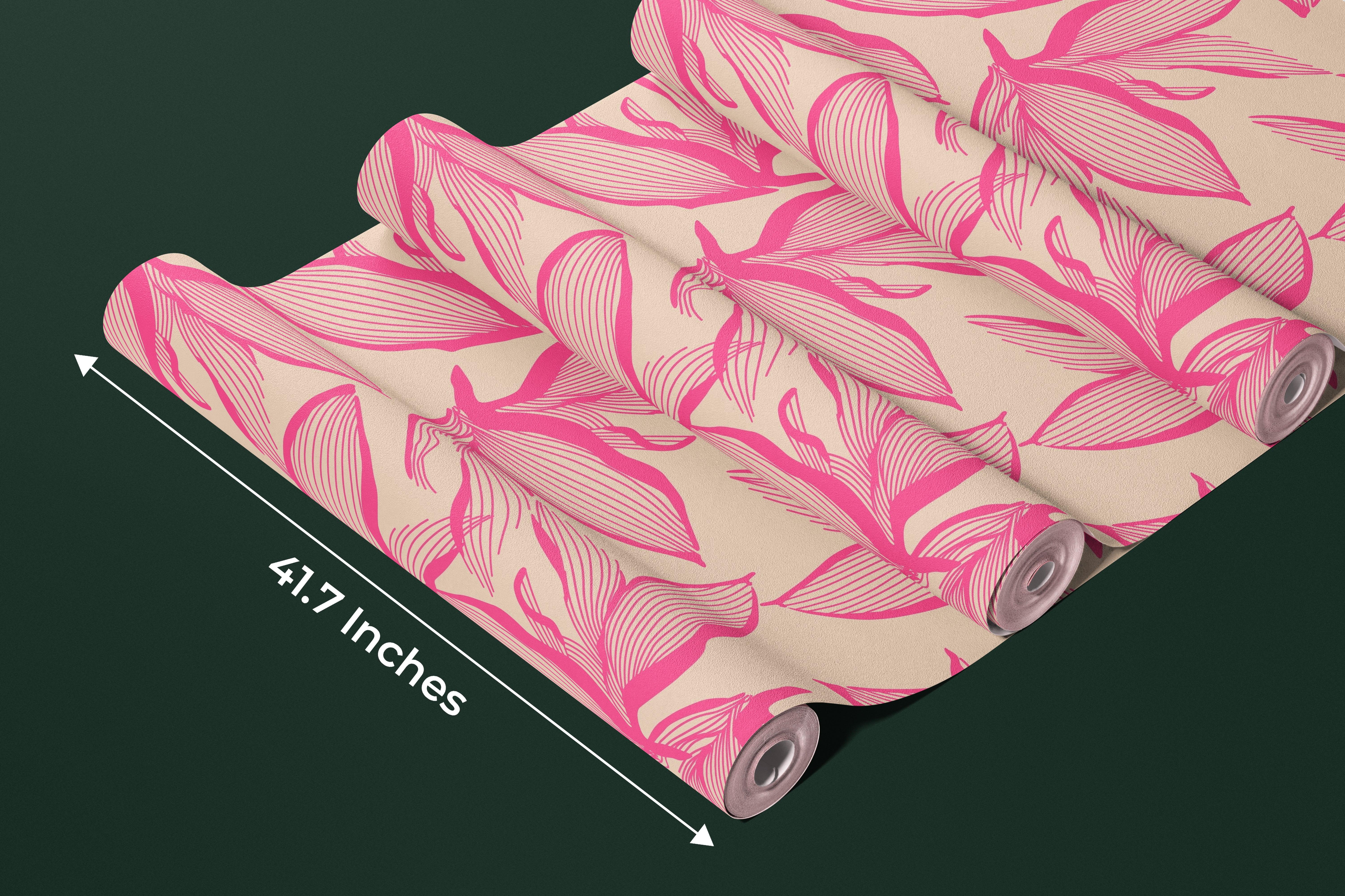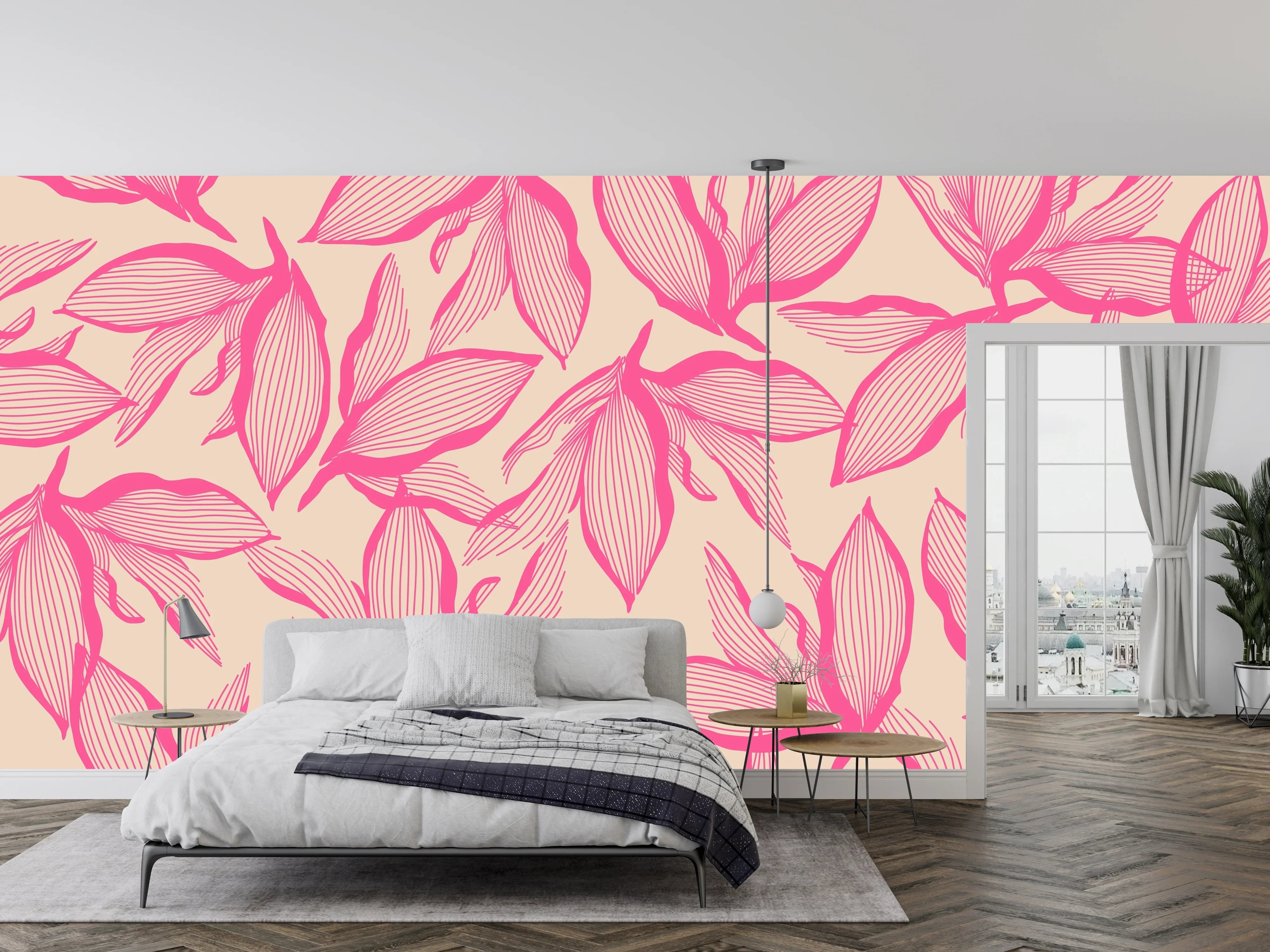 Pink Exotic Flowers Wallpaper, Seamless Pattern Mural, Oversized Custom Size Wall Art, Non-Woven, Non-Adhesive, Modern Wall Paper, Removable