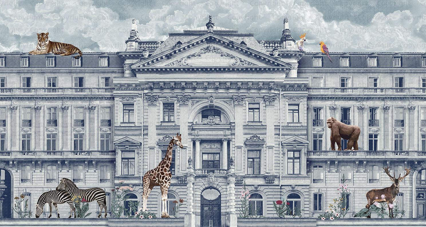 Modern Animals Building Wallpaper, Light Blue Jungle Wall Mural, Custom Size Architecture Wall Covering, Non-Woven, Non-Adhesive, Washable, Removable