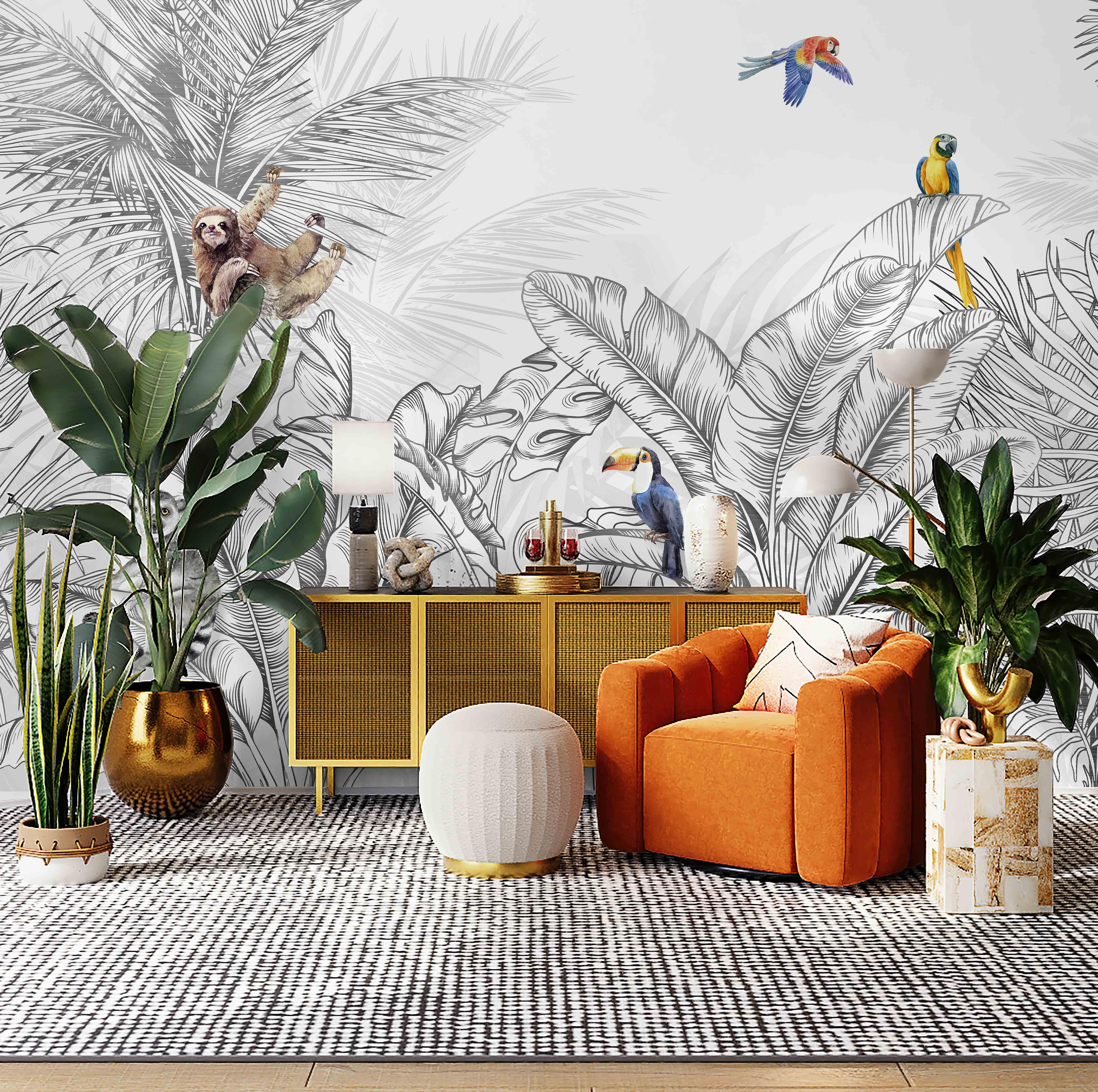 Tropical Animals Wallpaper, Black and White Drawing Wall Mural, Custom Size Wall Covering, Non-Woven, Non-Pasted, Removable, Art