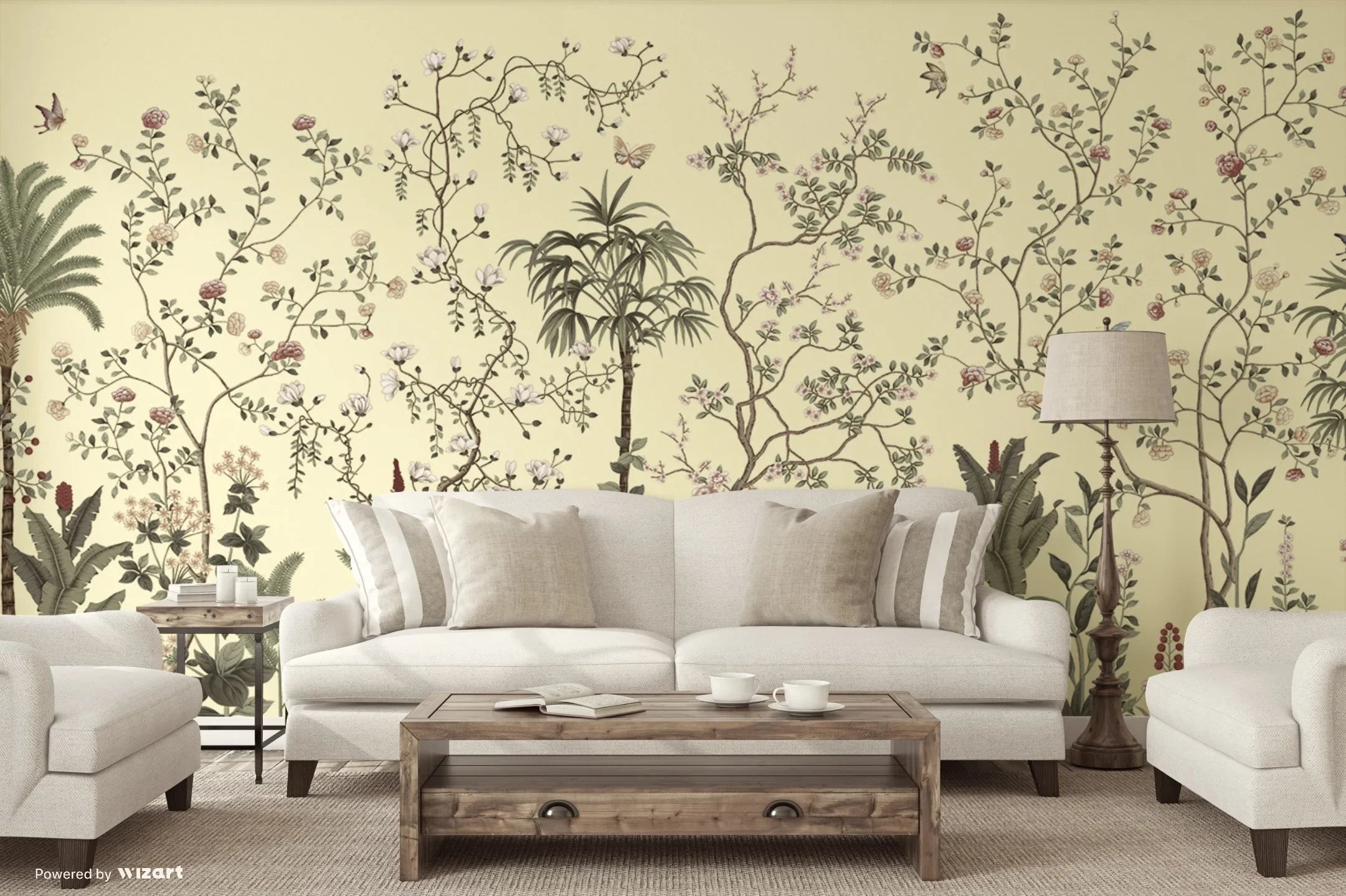 Yellow Botanical Wall Mural, Butterfly Flowers Chinoiserie Wallpaper, Nature Theme Custom Size Wall Covering, Non-Woven, Non-Pasted, Removable, Washable
