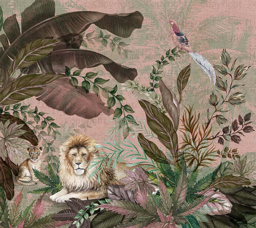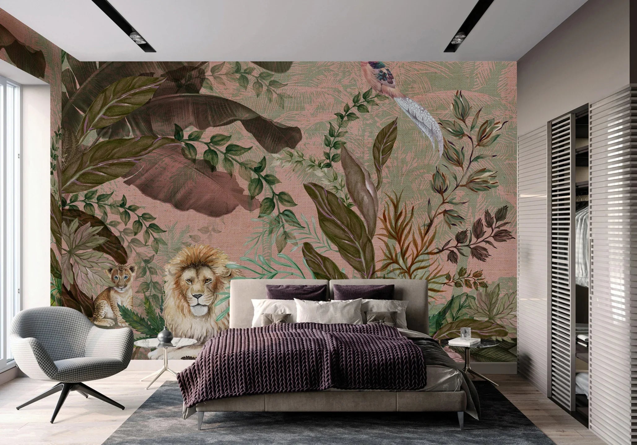 Lion Jungle Wall Mural, Purple Tropical Wall Mural, Interior Decor, Non-Pasted, Extra Large Wall Print, Removable, Forest Theme Wall Art
