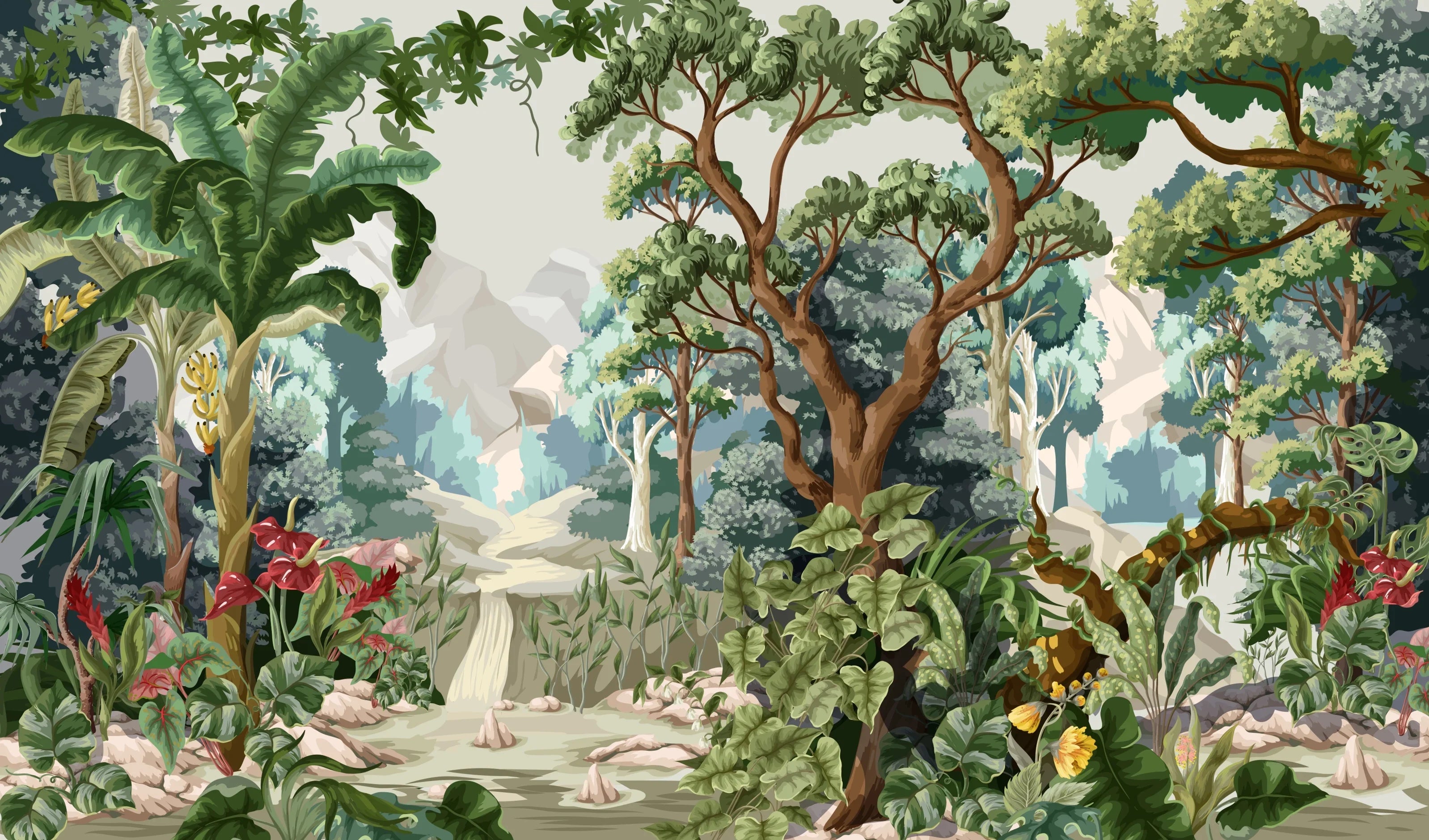 Jungle Wallpaper, Tropical Plants Mural, Oversized Custom Size Wall Art, Non-Woven, Non-Adhesive, Modern Wall Paper, Removable