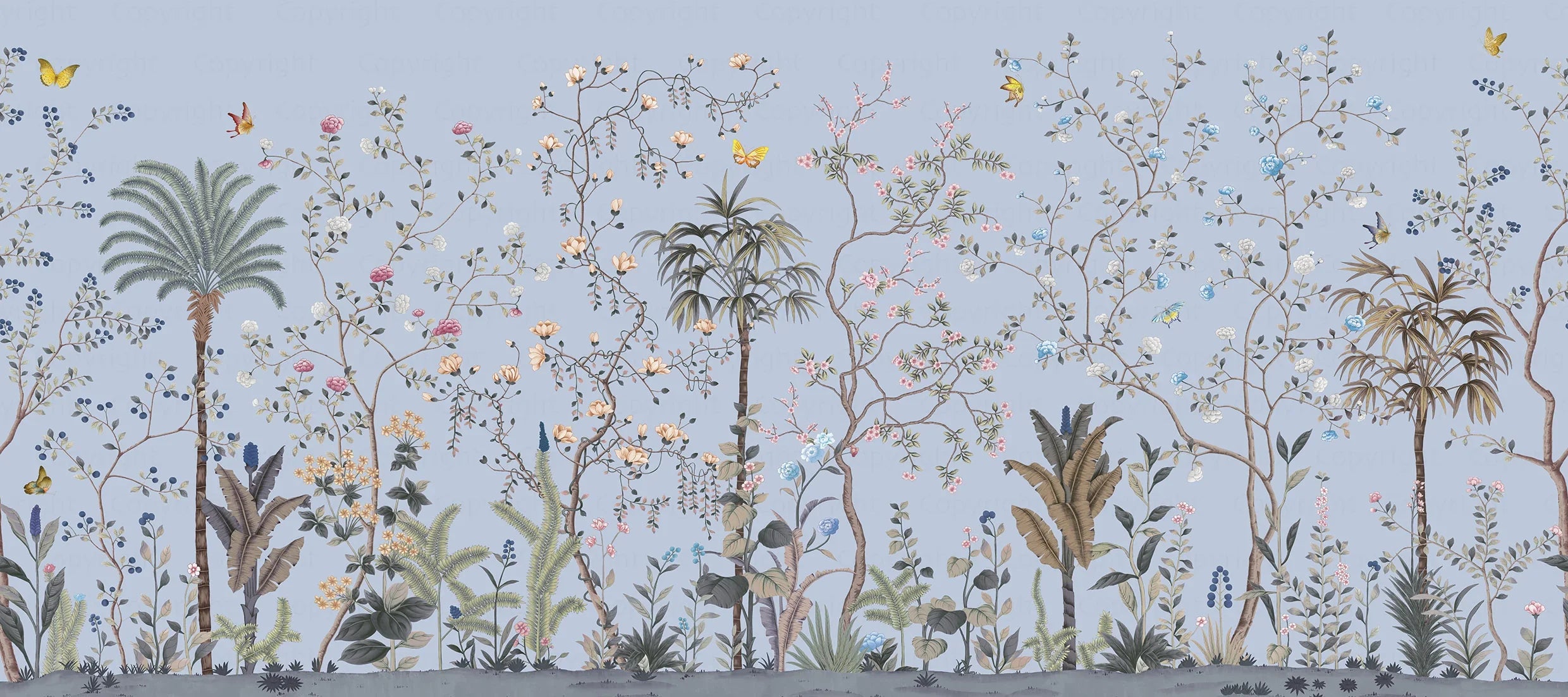 Blue Botanical Wall Mural, Butterfly Flowers Chinoiserie Wallpaper, Nature Theme Custom Size Wall Covering, Non-Woven, Non-Pasted, Removable, Washable
