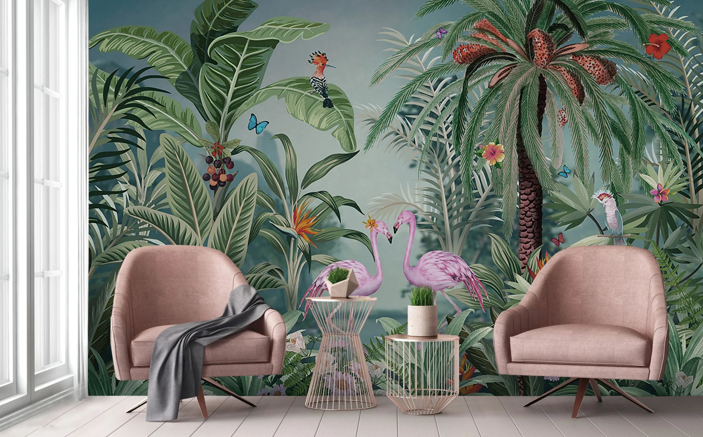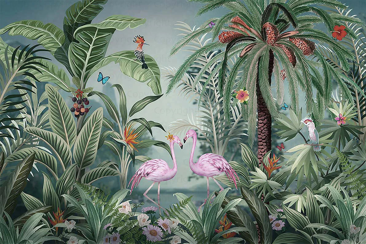Flamingo Nature Theme Wall Mural, Dark Green Forest Wallpaper, Custom Wall Mural, Wall Poster Home Interior Decor, Non-Adhesive, Non-Woven, Washable, Removable