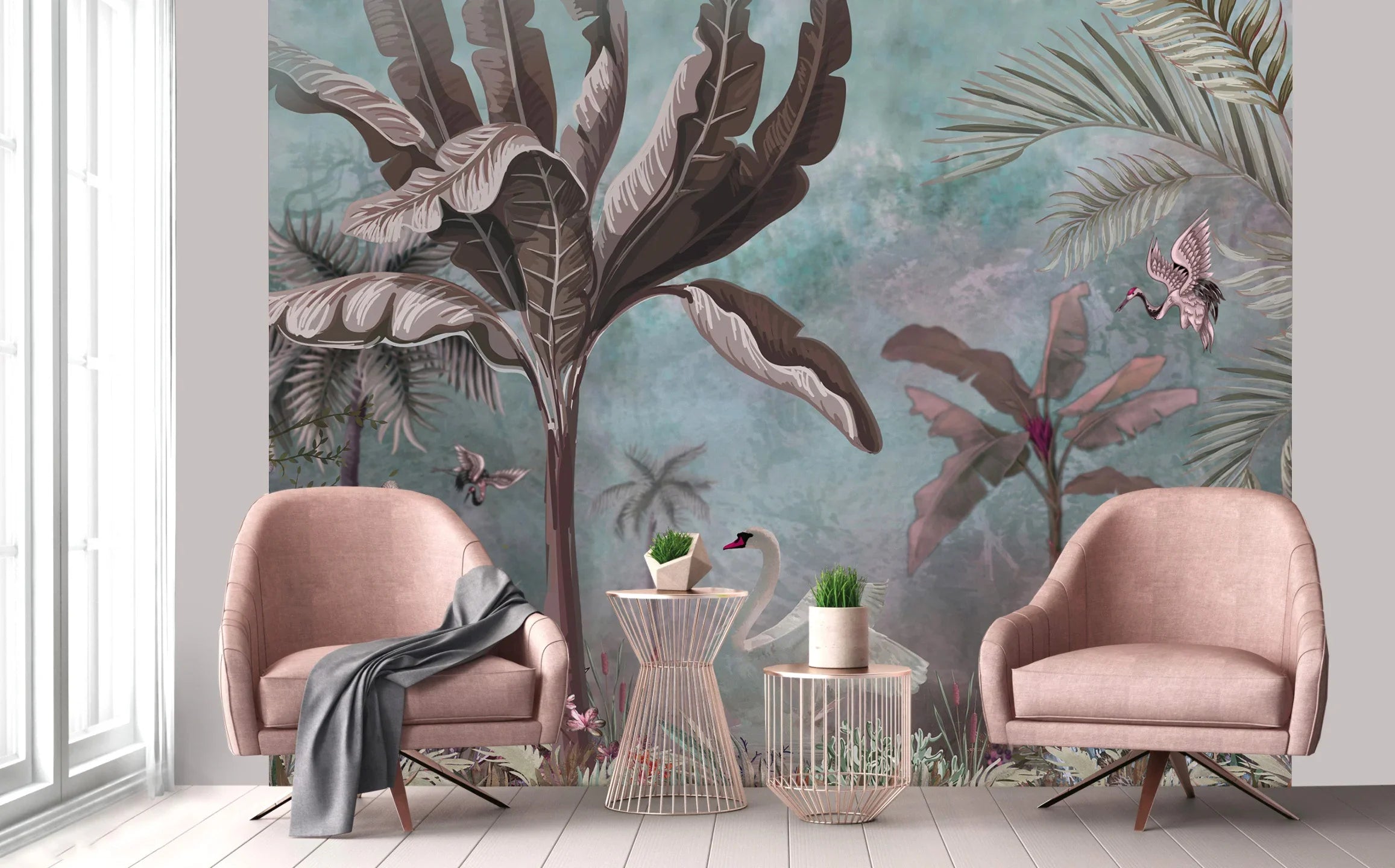 Green Modern Luxury Tropical Wallpaper, Swan, Non-Woven Custom Wall Mural, Non-Adhesive, Washable, Decorative, Removable, Home Decor Wall Art