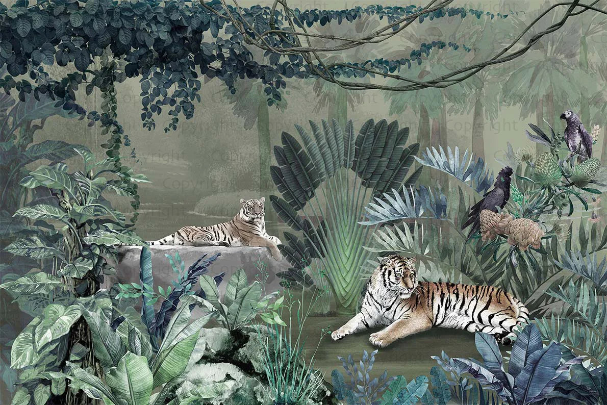 jungle Tigers Wall Mural, Green Nature Forest Theme Wallpaper, Custom Large Wall Mural, Non-Adhesive, Washable, Removable Wall Paper, Birds, Non-Woven Back