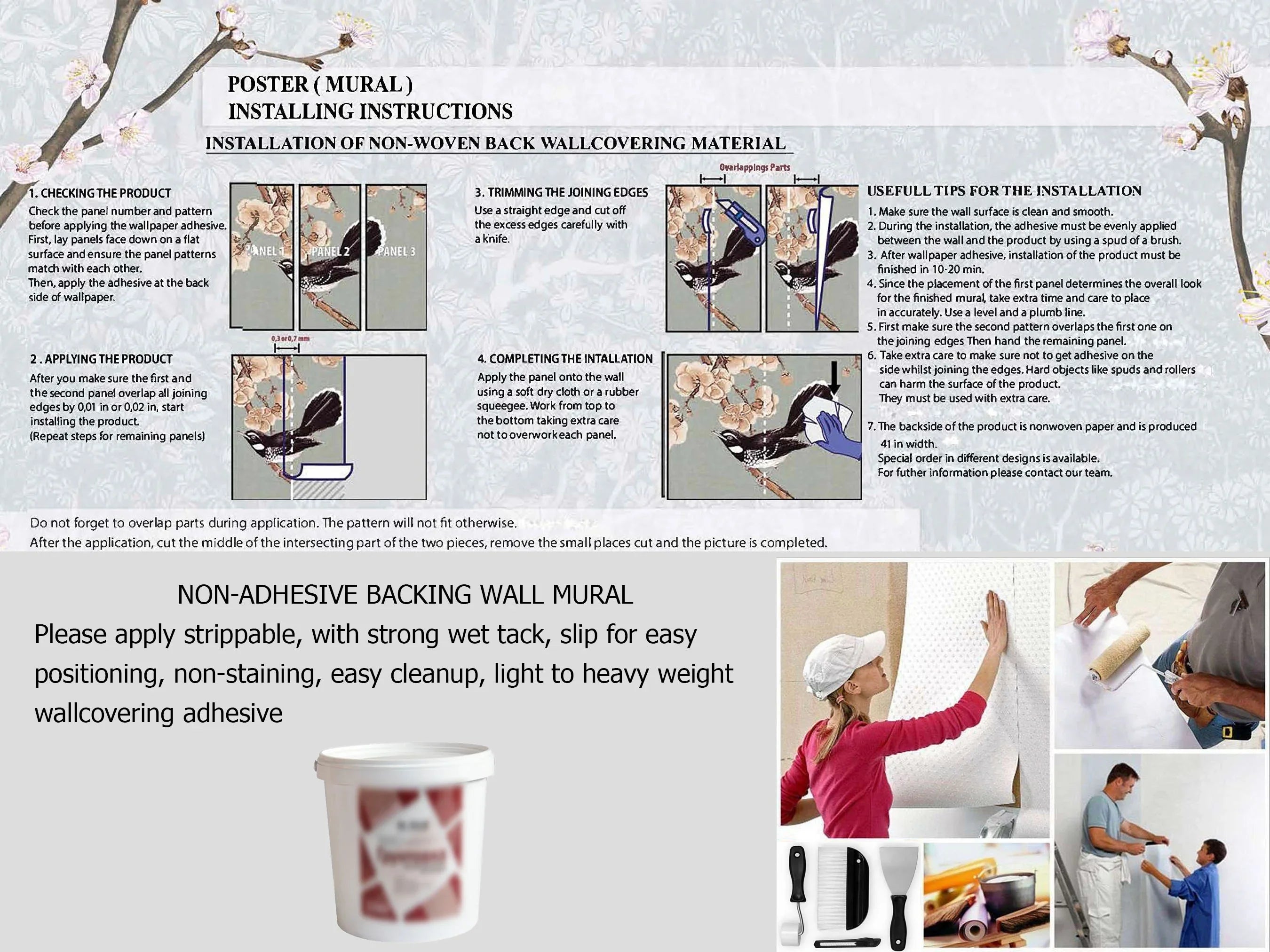 The non-paste backing requires you to apply wall adhesive to the surface. This allows you the flexibility to freely move and position each panel, ensuring precise alignment and seamless transitions. This method enables you to easily make adjustments as needed, resulting in a professional and refined appearance. Moreover, when it comes time for removal, it allows for easier removal without causing any damage to the underlying surface.